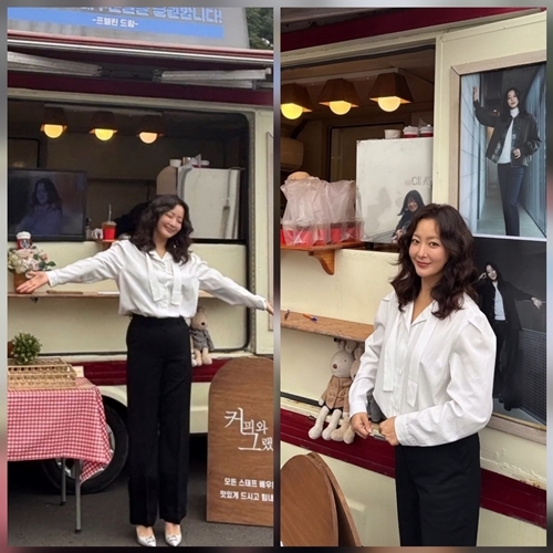 커피차에는 “김희선 배우님과 다음 생은 없으니까, 모든 스태프 배우분들을 응원합니다!”라는 응원 문구가 걸려 있어 눈길을 끌었다. 김희선은 화이트 블라우스와 블랙 팬츠로 단정하면서도 세련된 스타일을 완성, 특유의 단아한 미소로 현장의 분위기를 따뜻하게 물들였다.