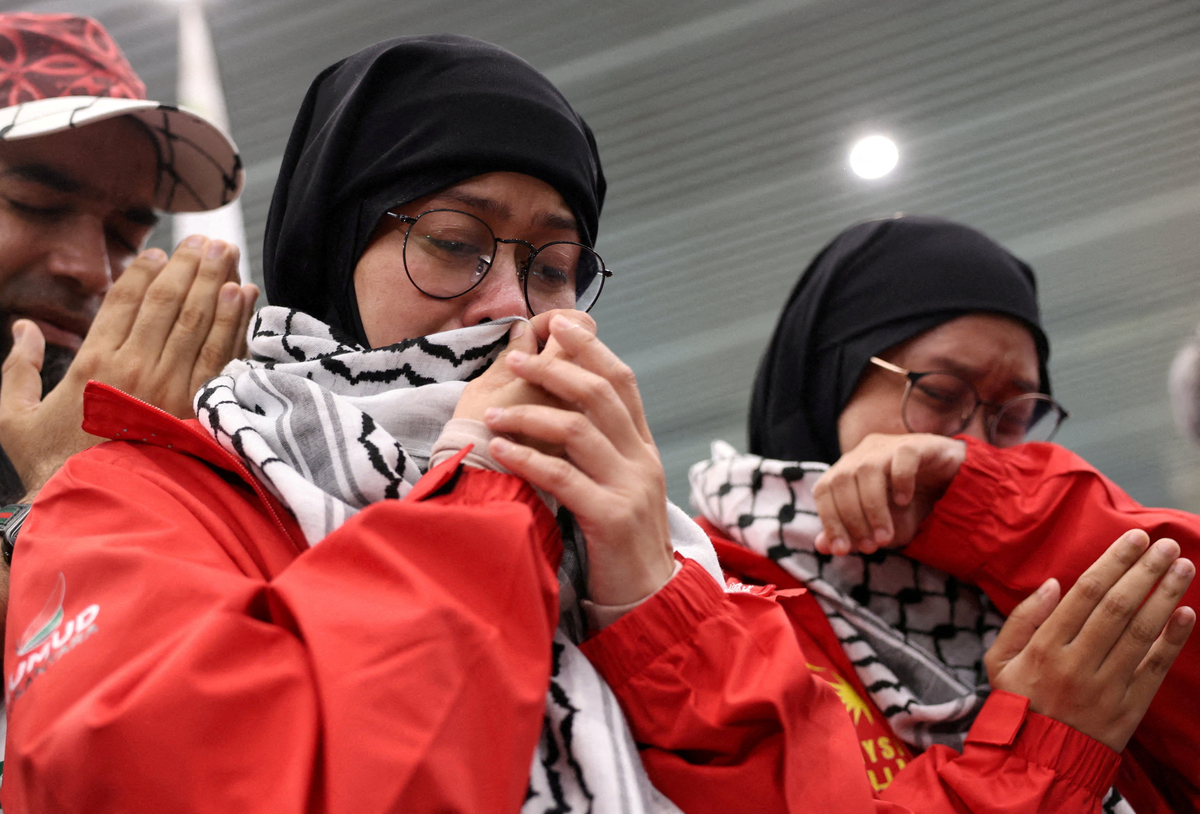 팔레스타인 가자지구 구호 선박 ‘글로벌 수무드 함대’에 탑승했다가 나포돼 이스라엘군에 구금됐던 말레이시아 활동가들이 7일(현지시간) 쿠알라룸푸르 국제공항을 통해 귀국해 눈물을 흘리고 있다. 로이터연합뉴스 |