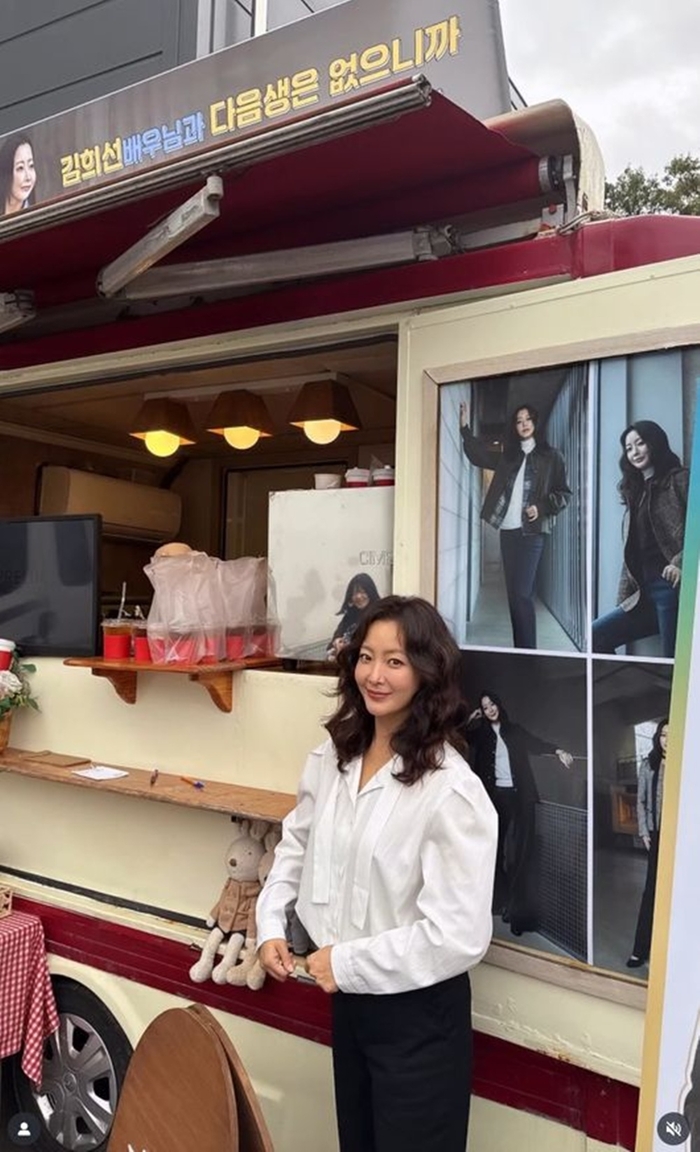 공개된 사진 속에는 김희선이 모델로 활약하는 여성 의류 브랜드 측에서 커피차를 선물한 모습이 담겨 있다.