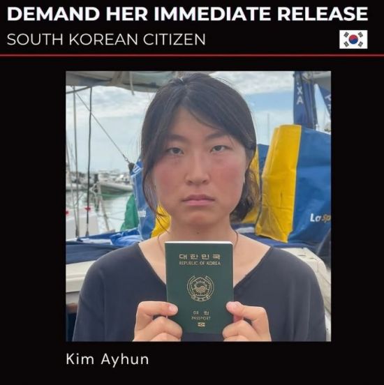 가자지구로 항해 하던 중 이스라엘군에 납치된 한국 평화활동가 김아현씨의 빠른 석방을 촉구하는 이미지. 강정친구들 인스타그램 캡처 |
