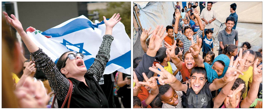 트럼프 발표에 환호하는 이·팔 시민들 9일(현지시간) 이스라엘과 하마스가 남은 인질들을 석방하기 위한 가자 휴전협정 1단계에 합의한 직후 이스라엘과 팔레스타인 시민들이 환호하고 있다. 왼쪽은 이스라엘 텔아비브 앞에 조성된 '인질들의 광장'에서 이스라엘 시민들이 국기를 들고 감격하는 모습. 오른쪽은 팔레스타인 가자지구 중부 누세이라트의 난민 캠프에서 팔레스타인 어린이들이 기뻐하는 모습. APAFP연합뉴스 |