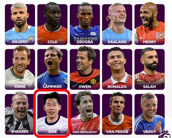 프리미어리그 시대 최고의 골잡이 후보에 손흥민(전 토트넘, 현 LAFC)이 당당히 이름을 올렸다. 9일 현재 손흥민은 12%의 득표율로 엘링 홀란(맨체스터 시티), 리그 최다 득점(260골)으로 17%를 얻은 앨런 시어러(전 블랙번·뉴캐슬)에 이어 공동 3위다. 크리스티아누 호날두(전 맨체스터 유나이티드)와 동률이다.