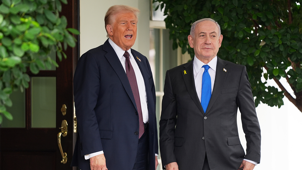 ▲ 도널드 트럼프 대통령(왼쪽)이 지난달 워싱턴 백악관에서 이스라엘 총리 베냐민 네타냐후를 맞이하고 있다.