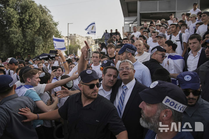 [예루살렘=AP/뉴시스] 극우 성향의 이타마르 벤그비르(가운데) 이스라엘 국가안보장관이 지난 5월 26일(현지 시간) 예루살렘에서 열린 연례 '예루살렘의 날' 행사에 참석해 사람들과 함께 행진하고 있다. 2025.05.26. |
