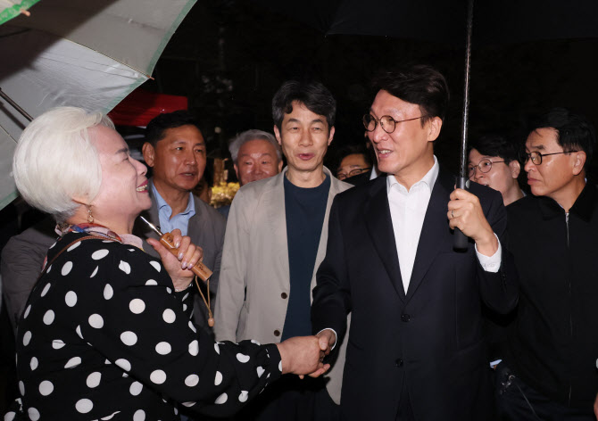 김민석 국무총리가 10일 서울 구로구 남구로 새벽인력시장을 찾아 한 자원봉사자와 인사를 나누고 있다.(사진=연합뉴스) |
