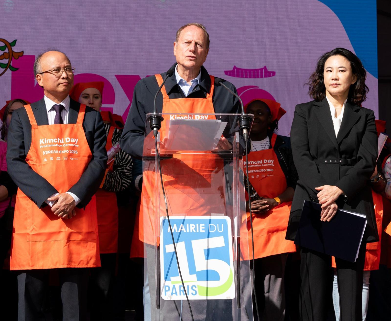 4일(현지 시간) 프랑스 파리 15구청 대광장에서 열린 ‘2025 코리안 엑스포―김치의 날 제정 선포식’에서 필리프 구종 파리 15구청장(가운데)이 ‘김치의 날’ 공식 제정을 선포하고 있다. 대상 제공 |