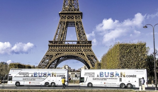 LG가 운영하는 \'2030 부산엑스포\' 홍보 버스 2대가 프랑스 파리 에펠탑 앞을 지나는 모습. 사진=LG |