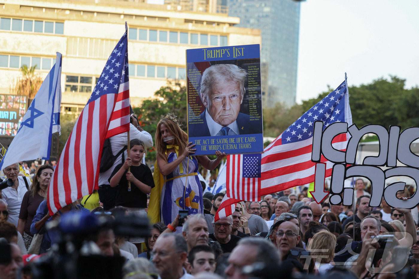 이스라엘 텔아비브에서 열린 가자지구 휴전 합의 환영 집회. 2025.10.11 ⓒ 로이터=뉴스1 ⓒ News1 이지예 객원기자 |