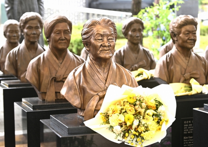 지난 8월13일 경기 광주시 나눔의집에 세상을 떠난 위안부 피해자 할머니들의 흉상에 꽃다발이 놓였다. /사진=뉴시스. |