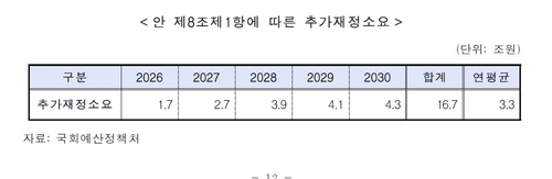 오늘(12일) 국회 등에 따르면 국회예산정책처는 보건복지위원회 더불어민주당 간사인 이수진 의원이 대표로 발의한 기초연금법 일부 개정안대로 부부 감액 제도가 폐지되면 2026년부터 2030년까지 5년간 연평균 3조3천억원, 총 16조7천억원의 재정이 추가로 소요될 것으로 전망했습니다.