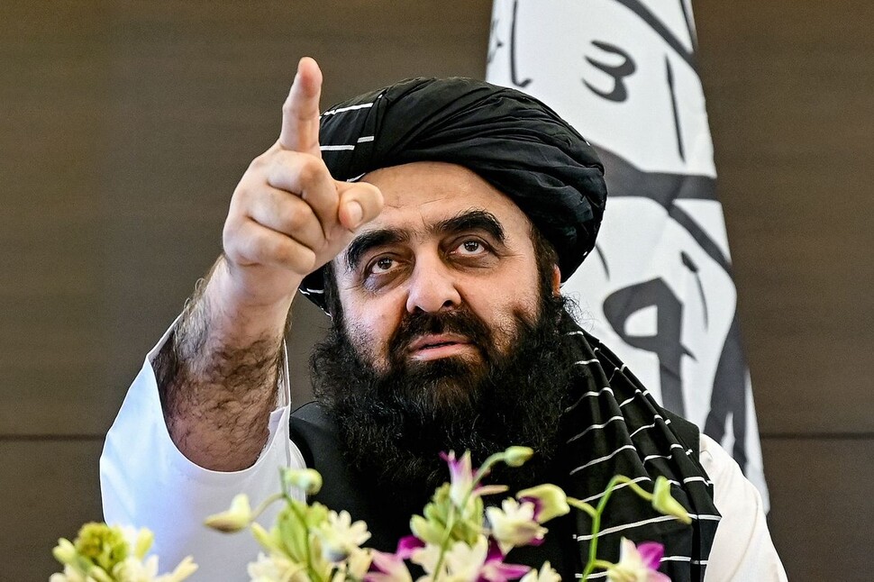 인도를 방문 중인 아미르 칸 무타키 아프가니스탄 외교부 장관이 12일 뉴델리의 아프간대사관에서 기자회견을 하고 있다. AFP 연합뉴스 |