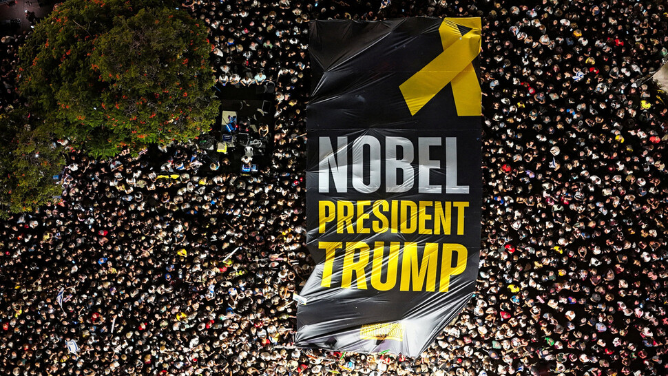 이스라엘 텔아비브의 ‘인질 광장’에서 11일 가자 전쟁 휴전과 인질 석방 합의에 즈음한 대규모 집회가 열려, 이를 중재한 도널드 트럼프 미국 대통령을 “노벨상 대통령”이락 치하하는 대형 펼침막이 등장했다. 로이터 연합뉴스 |