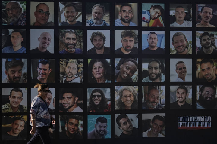 [예루살렘=AP/뉴시스] 지난 7일(현지시간) 이스라엘 예루살렘에 가자지구에 억류 중인 이스라엘 인질 사진이 걸려 있다. 2025.10.10. |