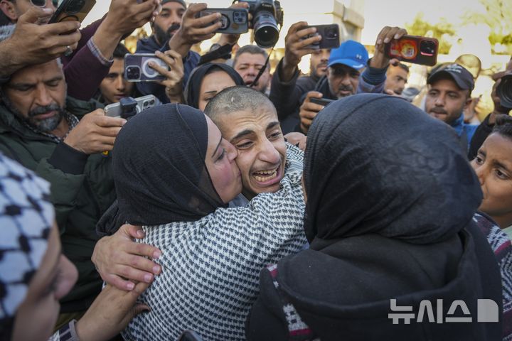 [칸유니스=AP/뉴시스] 이스라엘 교도소에서 풀려난 팔레스타인 수감자 모하메드(17)가 27일(현지시간) 가자지구 칸유니스에 도착해 누나와 재회하고 있다. 모하메드는 420일 동안 이스라엘 교도소에 갇혀 있었다. 2025.02.28 |