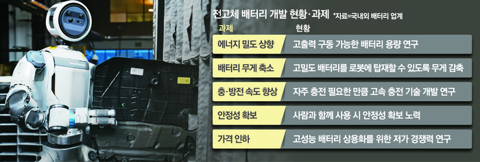 이에 따라 휴머노이드 로봇 산업의 가장 큰 기술 허들로 꼽히는 배터리 문제가 주목받고 있다. 낮은 용량과 짧은 가동시간 문제를 해결해야만 실제 산업 현장에서 유용하게 활용할 수 있기 때문이다. 그 해법으로 주목받는 기술이 바로 전고체 배터리다.