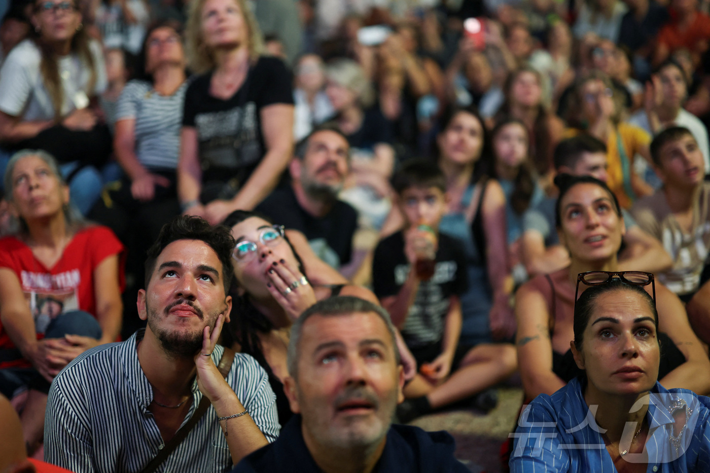 이스라엘과 하마스 간의 휴전이 발효된 이후인 11일, 이스라엘 텔아비브 인질 광장에 사람들이 모여 있다. 2025.10.11 ⓒ 로이터=뉴스1 ⓒ News1 강민경 기자 |