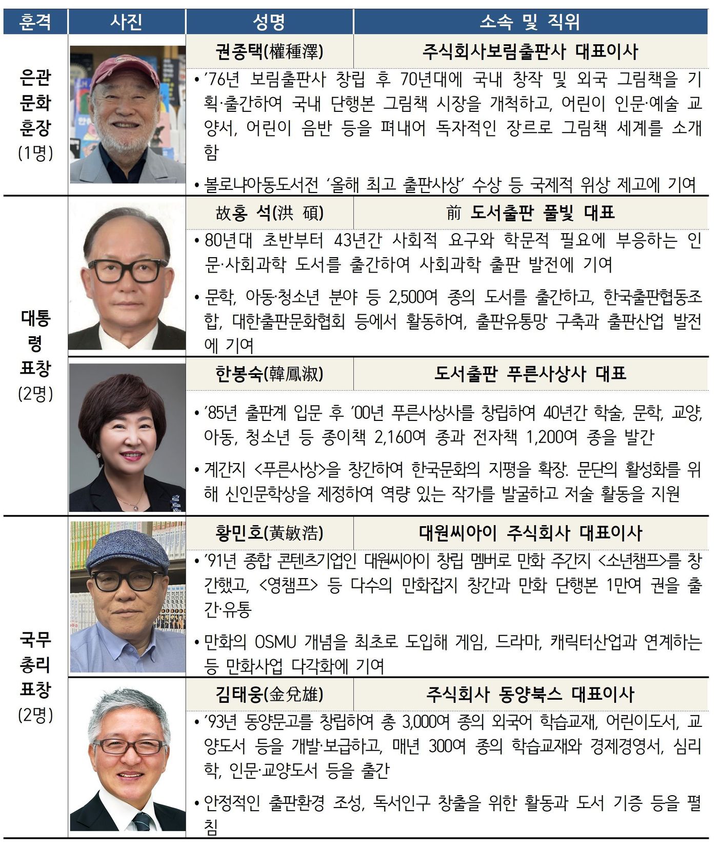 국무총리표창은 황민호 대원씨아이 대표이사와 김태웅 ㈜동양북스 대표이사가 수상한다. 황민호 대표는 '소년챔프'·'영챔프' 등 다수의 만화잡지를 창간하고 만화 단행본 1만여 권을 출간·유통했으며, 게임·드라마·캐릭터와 연계하는 OSMU 개념을 도입해 만화사업을 다각화했다. 김태웅 대표는 1993년 동양문고를 창립해 3000여 종의 외국어 학습교재·어린이도서·교양도서를 개발·보급하고 매년 300여 종을 출간했다.