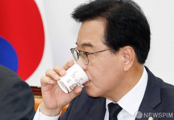 [서울=뉴스핌] 윤창빈 기자 = 송언석 국민의힘 원내대표가 13일 오전 서울 여의도 국회에서 열린 최고위원회의에서 물을 마시고 있다. 2025.10.13 pangbin@newspim.com |