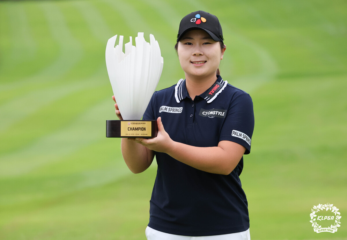 방신실이 지난 9월 열린 KLPGA 투어 OK저축은행 읏맨 오픈에서 우승을 차지한 후, 트로피를 들고 미소 짓고 있다. 사진=KLPGT 제공 |