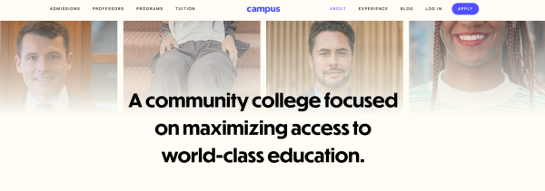 캠퍼스는 커뮤니티 칼리지를 혁신하겠다는 목표로 설립된 온라인 교육 플랫폼으로, 스탠퍼드, 프린스턴, 뉴욕대 교수진이 참여하는 정규 학위 과정을 제공한다. 연간 학비는 7320달러다. 학생들은 노트북, 모바일 Wi-Fi, 개인 코치, 24시간 튜터링을 지원받으며, 교수진은 한 과목당 최대 8000달러의 수익을 얻는다.