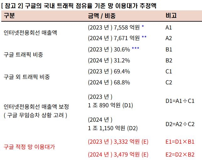 구글의 국내 트래픽 점유율과 매출액을 감안했을 때 지난해 최대 3479억원의 망 사용료를 부담했어야 한다는 지적이 나왔다.