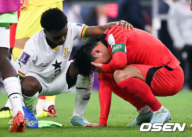 [OSEN=알 라이얀(카타르), 박준형 기자] 파울루 벤투 감독이 이끄는 축구대표팀은 28일(이하 한국시간) 카타르 알 라이얀의에듀케이션 시티 스타디움에서 카타르 월드컵 H조 조별리그 2차전 가나와 맞대결을 펼쳐서 난타전 끝에 2-3으로 패했다.앞선 우루과이 상대로 0-0 무승부에 그친 한국은 잡아야 했던 가나 상대로 패배하면서 1무 1패로 조별리그 최하위로 떨어졌다. 한국은 3차전서 포르투갈과 맞붙는다.경기종료 후 손흥민이 아쉬워하괴 있다. 2022.11.28 / soul1014@osen.co.kr |