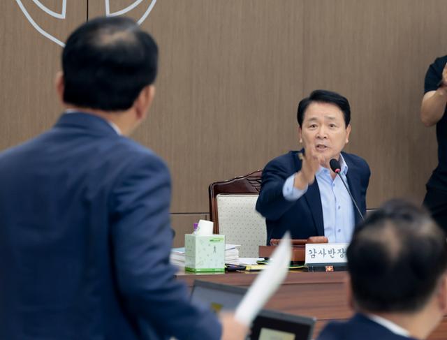 2025 국정감사 첫날인 13일 서울 용산구 국방부 청사에서 열린 국방위원회의 국방부 등에 대한 국정감사에서 김병주((왼쪽) 더불어민주당 의원과 성일종 국회 국방위원장이 언쟁을 벌이고 있다. 고영권 기자 |