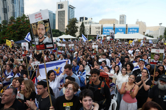 13일(현지시간) 이스라엘과 하마스 간 포로-인질 교환 및 휴전 협상의 일환으로 팔레스타인 가자지구에 억류된 이스라엘 인질들의 귀환을 기다리는 시민들이 모여있다. (사진=로이터) |