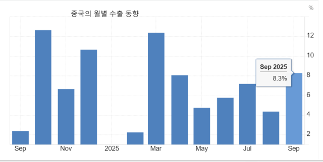 13일 중국 해관총서에 따르면 중국의 9월 수출액은 달러 기준으로 3285억7000만 달러(약 469조8879억원)로 작년 동월 대비 8.3%가 증가했다. 이는 8월 수출 증가율(4.4%)은 물론, 로이터가 집계한 시장 전문가들의 전망치(6.0%)도 모두 상회하는 것이다.