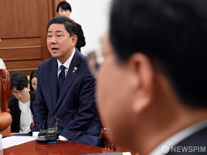 [서울=뉴스핌] 류기찬 기자 = 김병기 더불어민주당 원내대표가 13일 오후 서울 여의도 국회에서 열린 국회의장 주재 여야 원내대표 회동에서 발언을 하고 있다. 2025.10.13 ryuchan0925@newspim.com
