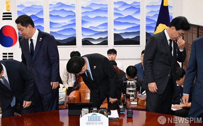 [서울=뉴스핌] 류기찬 기자 = 우원식 국회의장과 여야 원내대표가 13일 오후 서울 여의도 국회에서 열린 국회의장 주재 여야 원내대표 회동에서 자리하고 있다. 왼쪽부터 김병기 더불어민주당 원내대표, 우원식 국회의장, 송언석 국민의힘 원내대표. 2025.10.13 ryuchan0925@newspim.com