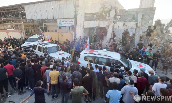 적십자 차량이 2023년 10월 7일 공격 이후 가자에서 억류됐던 인질들을 이송하고 있다. 이 인질들은 13일 하마스와 이스라엘 간의 휴전 및 인질-수감자 교환 합의의 일환으로 인도되었다. [사진=로이터 뉴스핌] |
