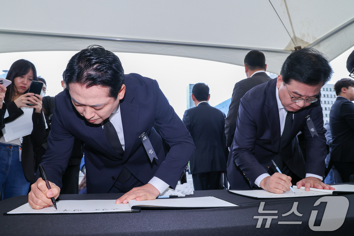 장동혁 국민의힘 대표, 송언석 원내대표가 13일 서울 여의도 국회에서 의원총회를 마친 뒤 김건희 특검 조사를 받던 중 숨진 양평군청 공무원 분향소를 찾아 조문록을 작성하고 있다. 2025.10.13/뉴스1 ⓒ News1 안은나 기자 |