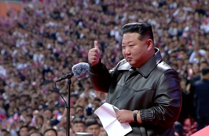 한편 김 위원장은 이날 대집단체조 및 예술 공연인 '조선노동당 만세'를 열병식 참가자들과 함께 관람할 때도 같은 가죽점퍼를 입었다.