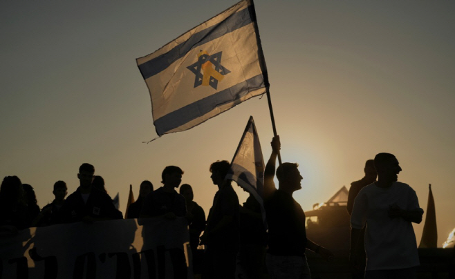13일(현지시간) 이스라엘 남부 레임 인근 군 기지 앞에서 가자지구에 억류된 이스라엘 인질들의 석방을 앞두고 사람들이 이스라엘 국기를 들고 모이고 있다. /AP 연합 |