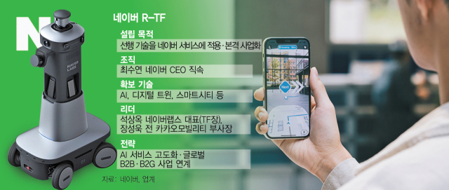13일 정보기술(IT) 업계에 따르면 네이버는 최근 최고경영자(CEO) 직속 ‘R-TF’를 신설했다. R-TF는 네이버랩스 등이 연구해 온 첨단 기술을 본격적으로 사업화하기 위해 설립됐다. 네이버 관계자는 “R-TF는 네이버랩스가 보유한 첨단기술과 연구성과를 네이버 서비스 및 사업 전반에 유기적으로 적용하고 확산한다”고 밝혔다.