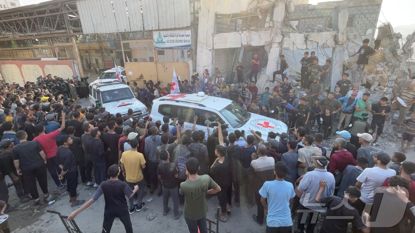 (가자시티 로이터=뉴스1) 이창규 기자 = 적십자 차량이 팔레스타인 무장정파 하마스가 석방한 이스라엘 인질들을 이송하고 있다. 2025.10.13./뉴스1 ⓒ 로이터=뉴스1