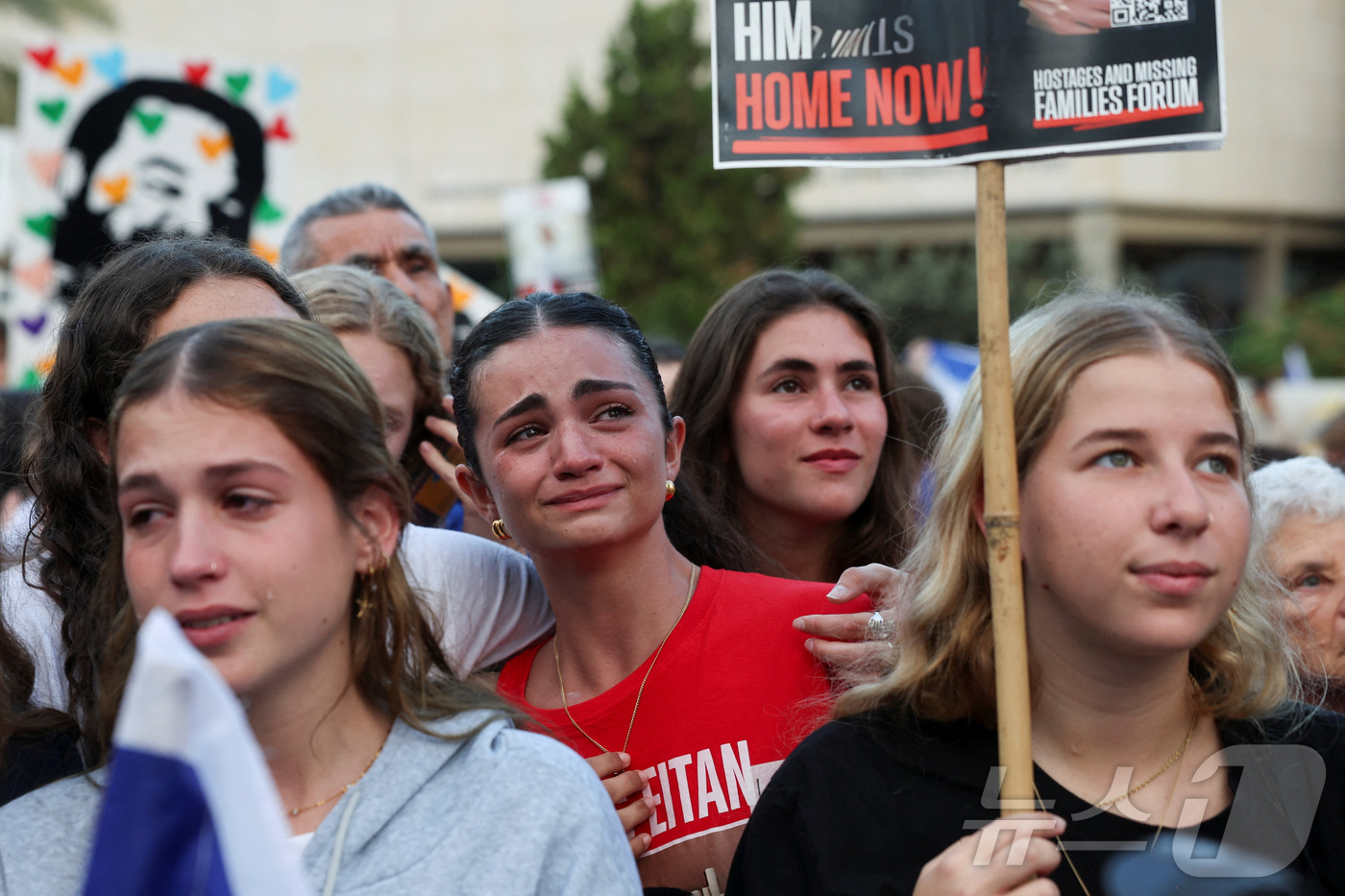 (텔아비브 로이터=뉴스1) 김경민 기자 = 가자지구에 억류되어 있는 이스라엘 인질의 송환을 기다리기 위해 13일(현지시간) 텔아비브 인질광장에 모인 사람들. 2025.10.13 ⓒ 로이터=뉴스1