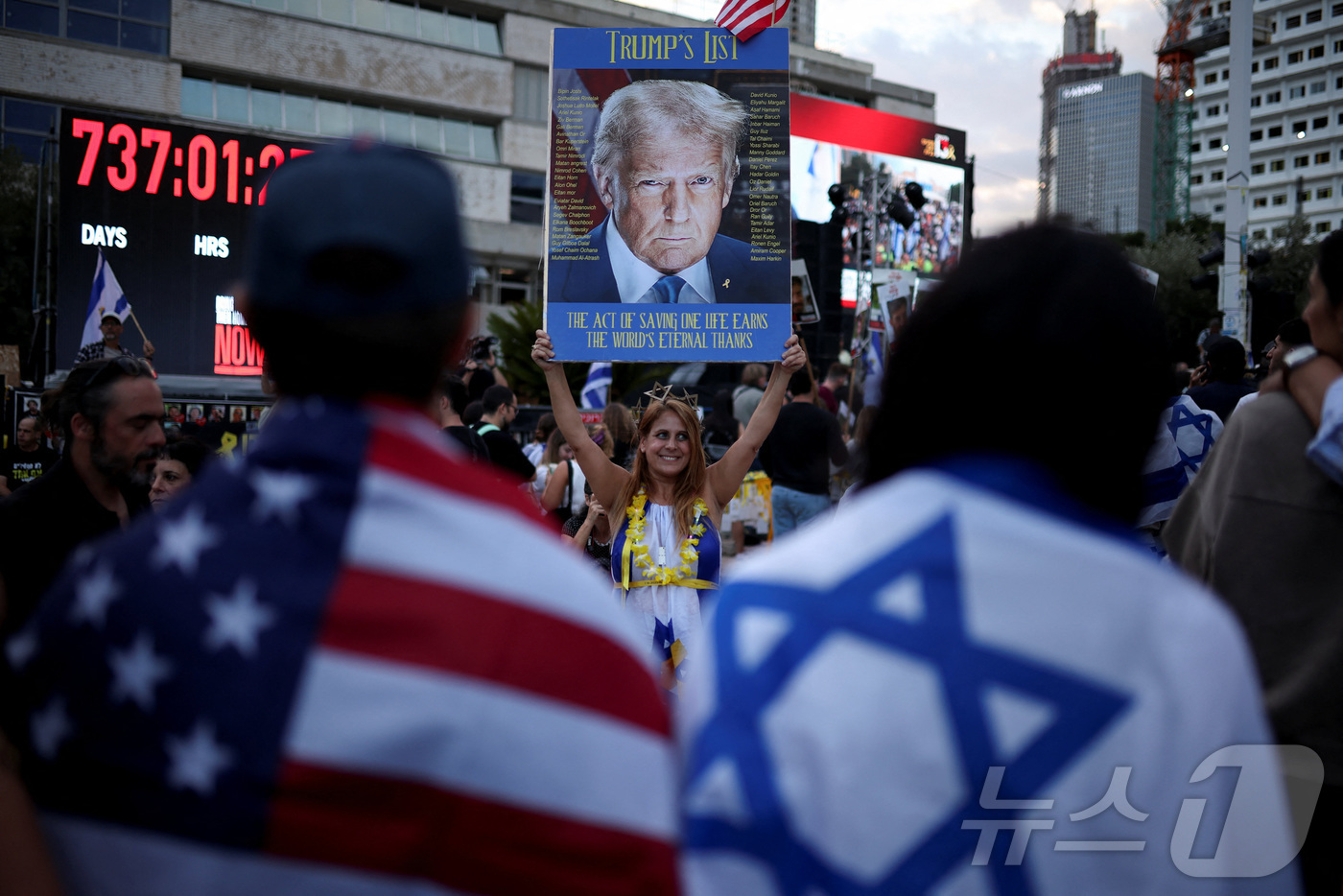 이스라엘의 인질 석방 환영 집회에서 한 참가자가 도널드 트럼프 미국 대통령의 사진을 들어보이고 있다. 2025.10.13 ⓒ 로이터=뉴스1 ⓒ News1 이지예 객원기자 |