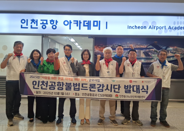 '인천공항불법드론감시단'은 센터가 인천국제공항공사와 구세군이 주관하는 '2025 건강한 인천공동체 만들기 공모사업'에 선정돼 사업비를 지원받아 운영하는 노인 일자리 사업으로, 중구 지역 어르신 5명으로 구성됐다.