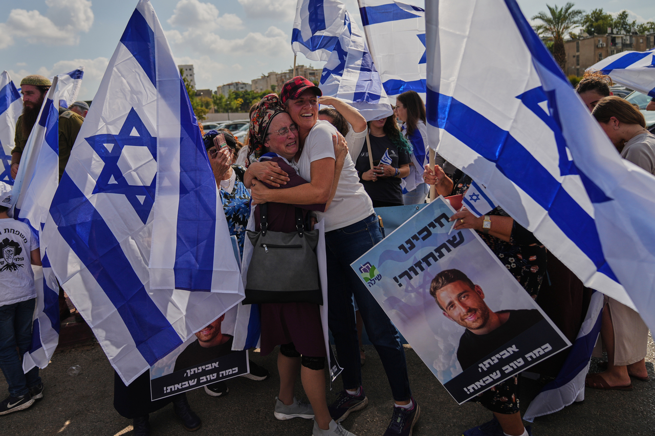 13일(현지시간) 가자지구 하마스 포로 석방 후 일부 석방된 인질들이 도착할 것으로 예상되는 이스라엘 페타 틱바의 베일린슨 병원 밖에서 사람들이 이스라엘 국기를 흔들며 기다리고 있다. [AP] |