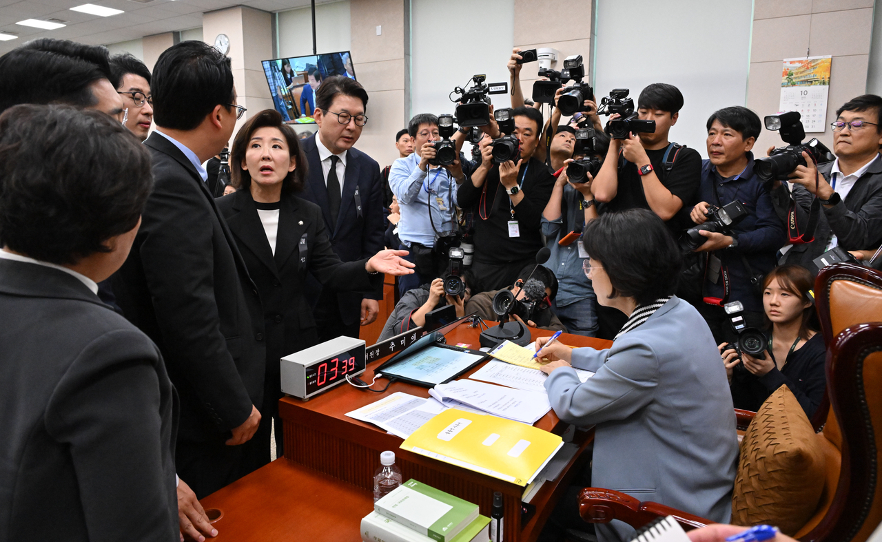 13일 오전 서울 여의도 국회 법제사법위원회에서 열린 대법원 등에 대한 국정감사에서 국민의힘 의원들이 추미애 법사위원장을 향해 항의하고 있다. 임세준 기자 |