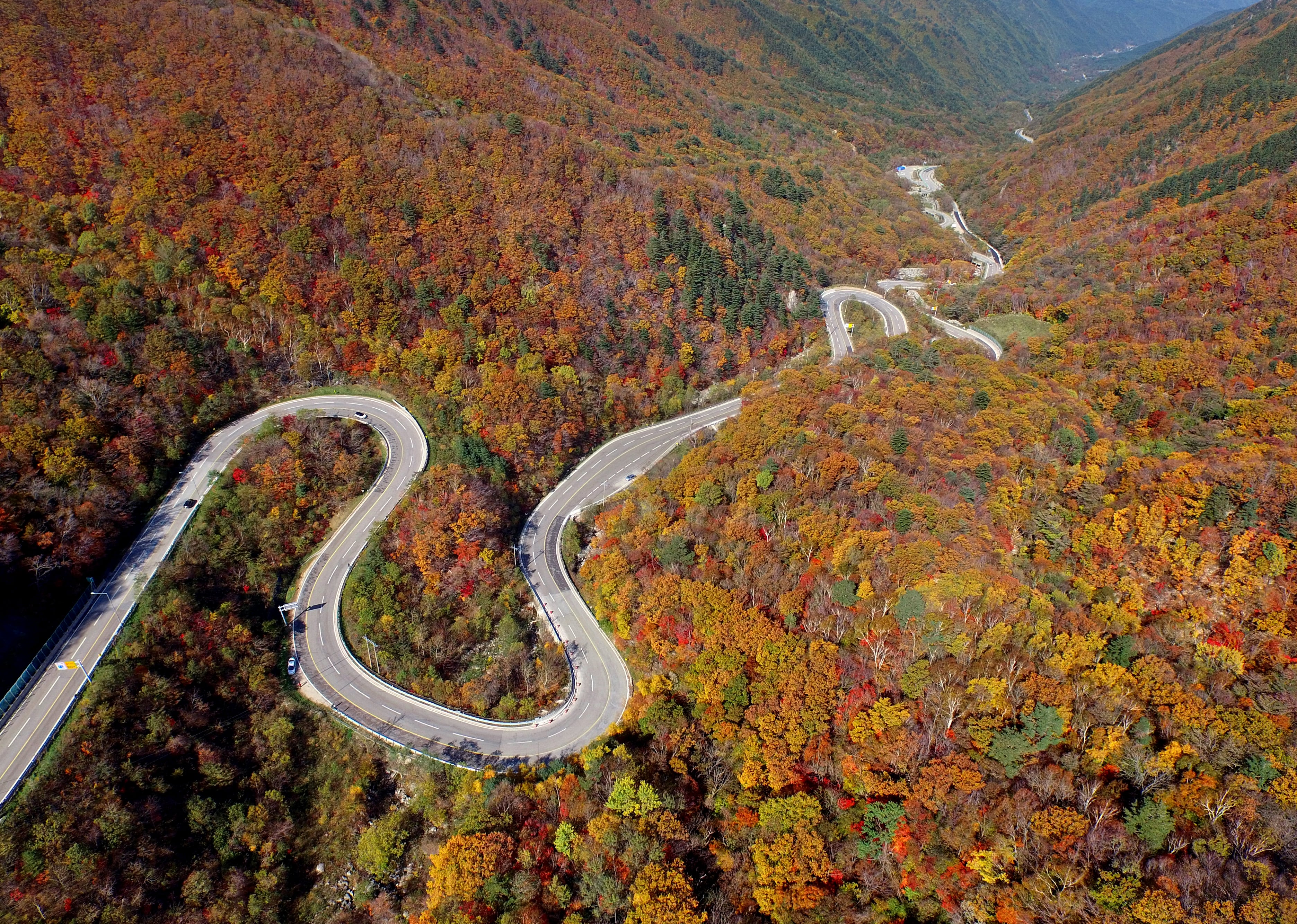 2017년 10월 13일 드론으로 촬영한 강원도 홍천 운두령 단풍./박상훈 기자 |