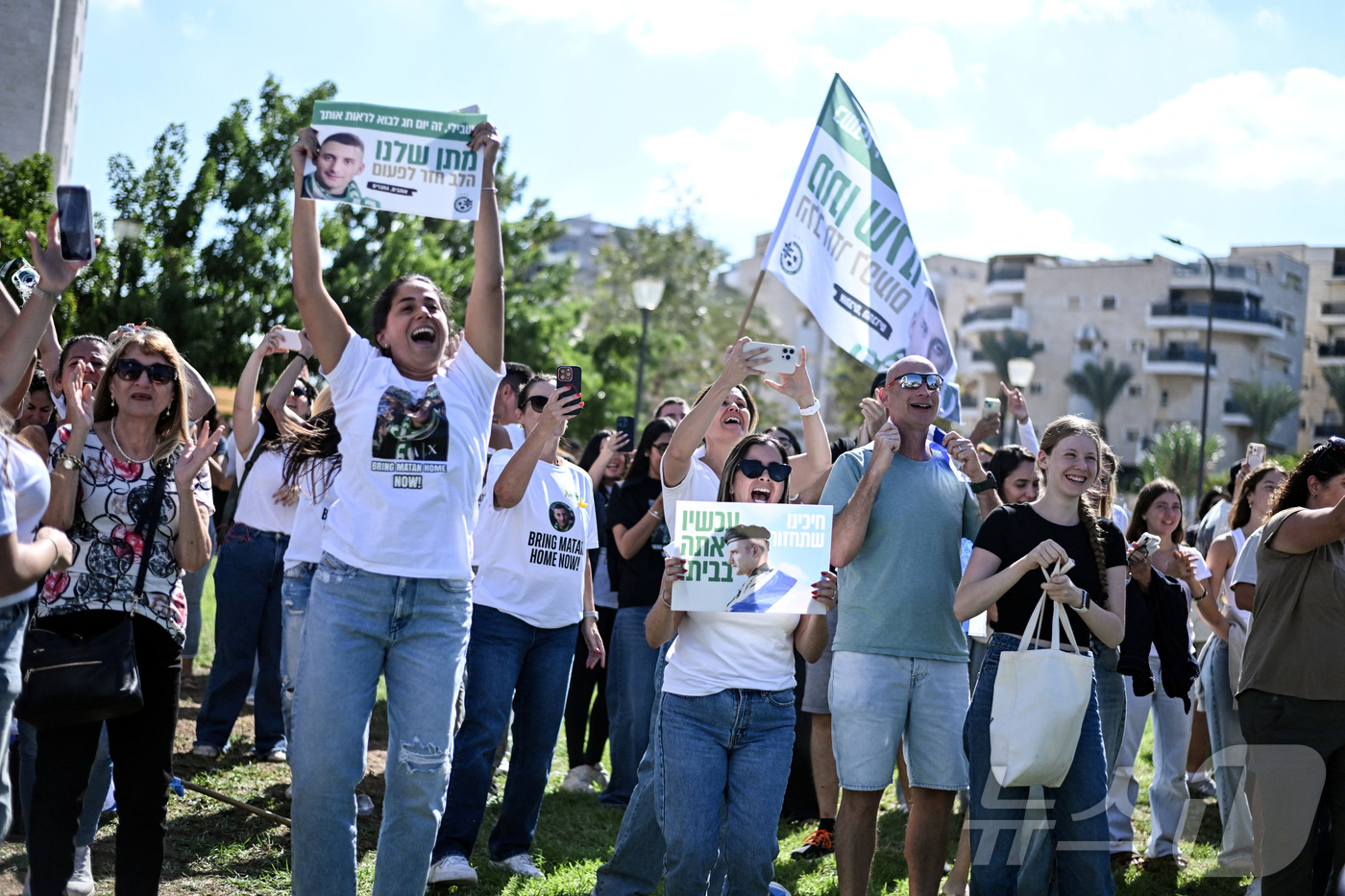 (키랴트 비알리크 로이터=뉴스1) 이창규 기자 = 이스라엘 국민들이 13일(현지시간) 하마스가 가자지구에 억류하고 있던 인질들을 석방하자 환호하고 있다. 2025.10.13./뉴스1 ⓒ 로이터=뉴스1