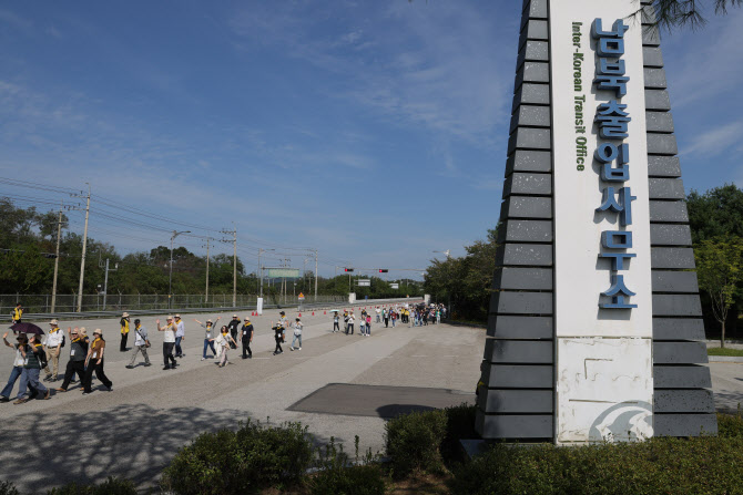 지난 달 27일 오후 경기도 파주시 경의선 남북출입사무소 앞에서 노무현 재단과 통일부 등이 공동개최한 10.4 남북정상선언 18주년 기념 ‘평화를 걷다’ 행사에서 참가자들이 개성공단으로 이어지는 도로를 따라 행진하고 있다.(사진=연합뉴스) |