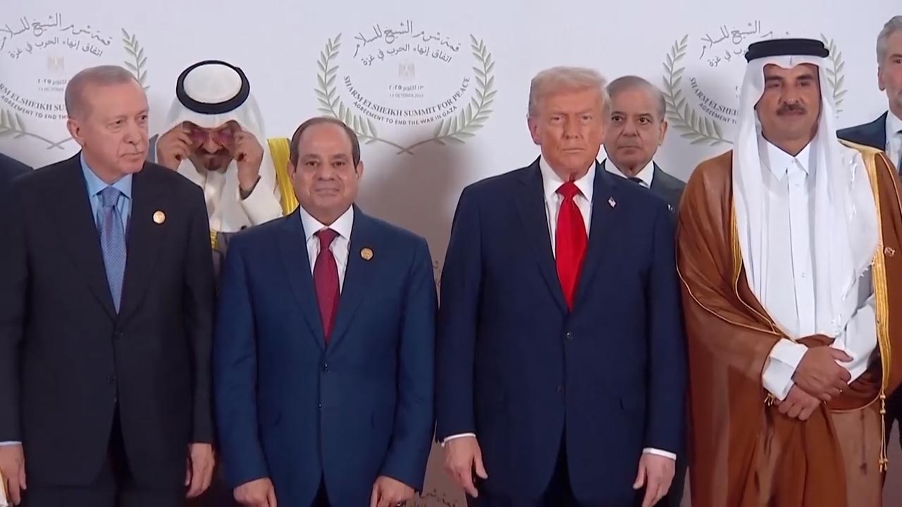 트럼프 대통령은 가자 전쟁 휴전 선언 합의문 서명을 위해 한 자리에 모인 유럽과 중동 30여 개국 정상들과 악수와 사진 촬영에만 20분 넘는 시간을 썼습니다.