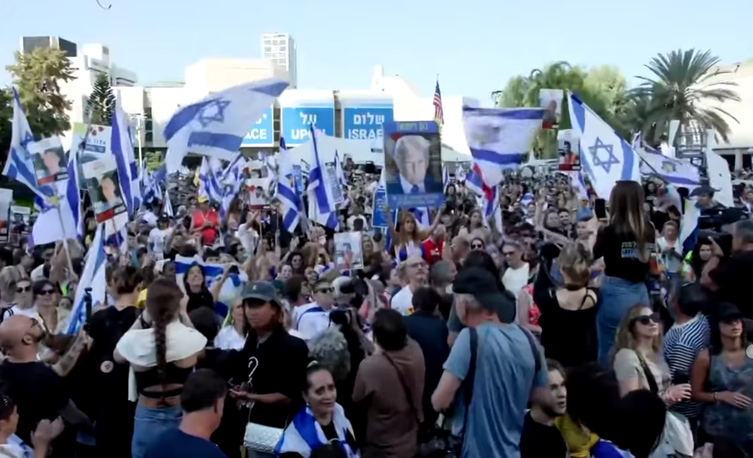 이스라엘 텔아비브 광장에서 13일(현지시간) 인질 석방 소식이 전해지자 도널드 트럼프 미국 대통령의 플래카드를 흔들며 “땡큐 트럼프”를 연호하고 있는 이스라엘 시민들. 유튜브 캡처 |