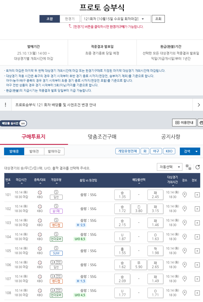 [스포츠서울 | 이소영 기자] 2025 KBO 포스트시즌 준플레이오프(준PO) 삼성- SSG의 4차전을 대상으로 한 프로토 승부식 121회차 게임 발매 마감이 임박했다.