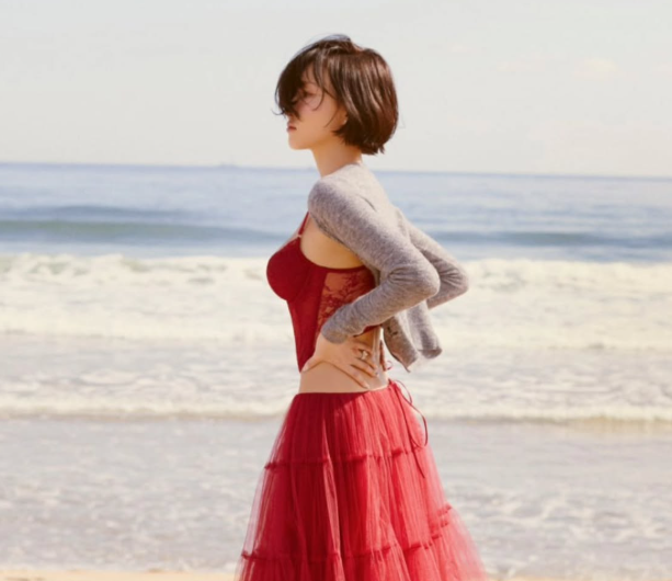 사진 속 화사는 모래사장에서 빨간 투 피스 드레스를 입고 시크하면서도 자연스러운 분위기를 자아냈다.