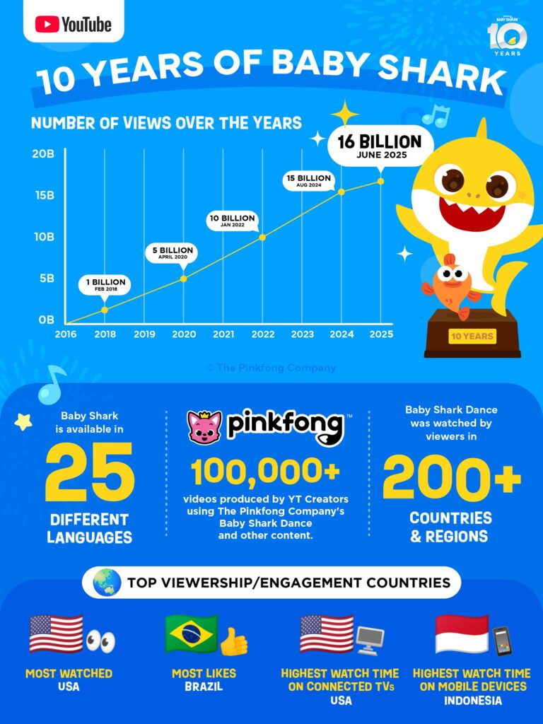 2015년 처음 선보인 핑크퐁의 '아기상어'가 10주년을 맞았다. 2016년 유튜브에 게시된 '베이비 샤크 댄스' 영상은 160억 조회수를 돌파했다.